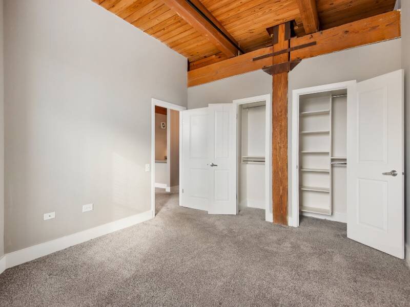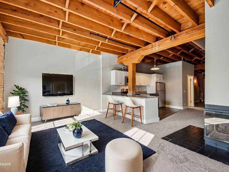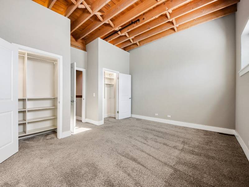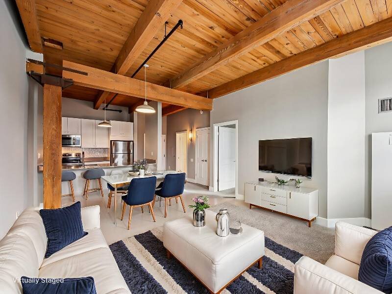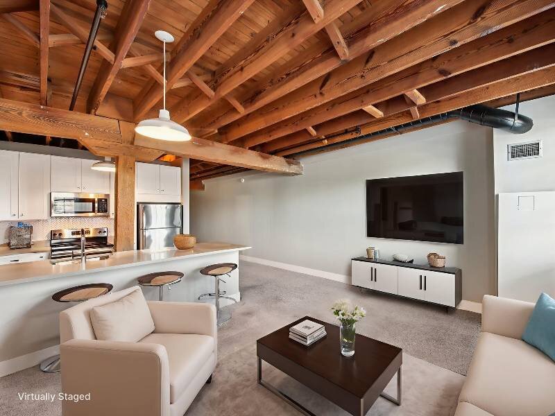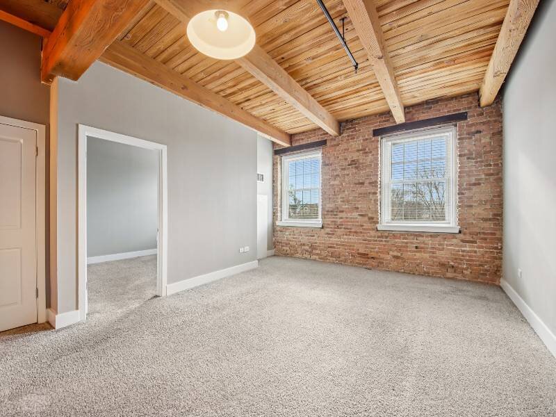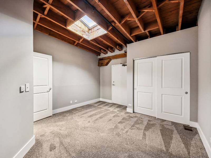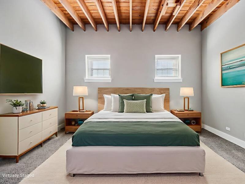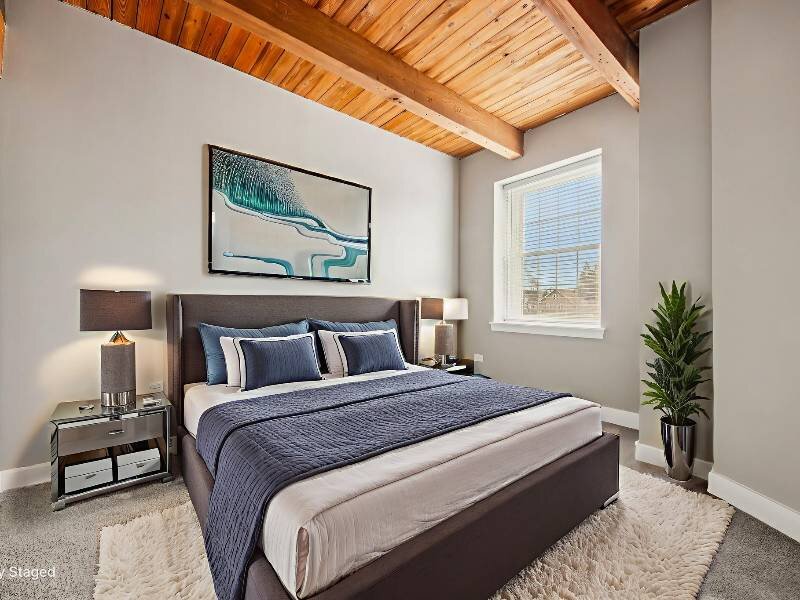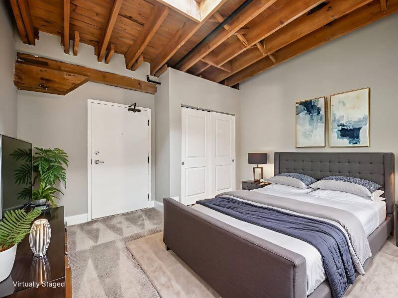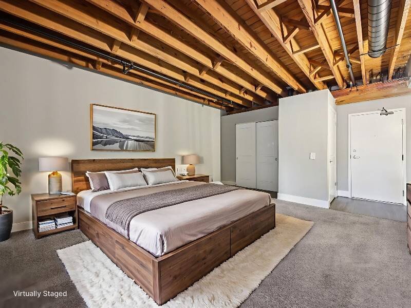 Staged Bedroom with Exposed Wood Struts | 5th Avenue Station